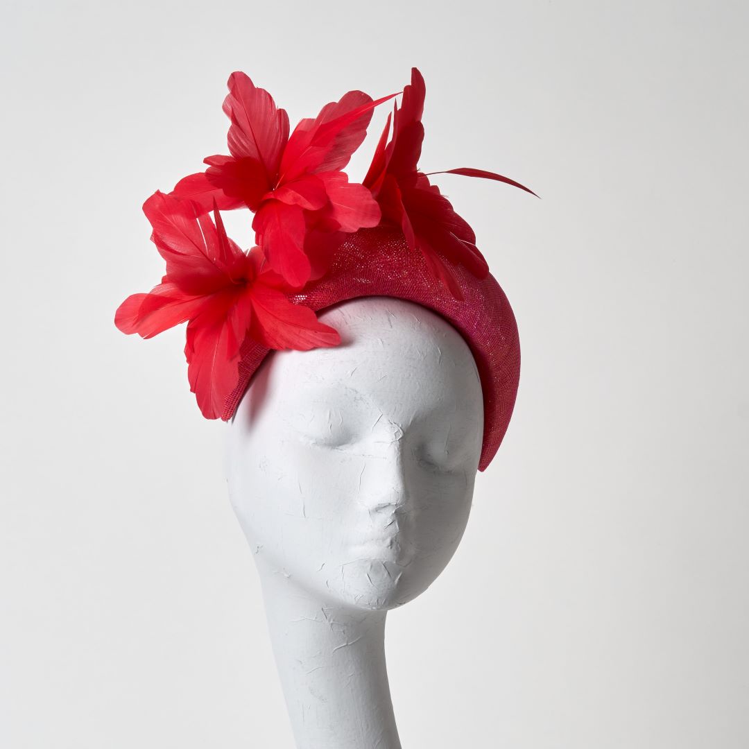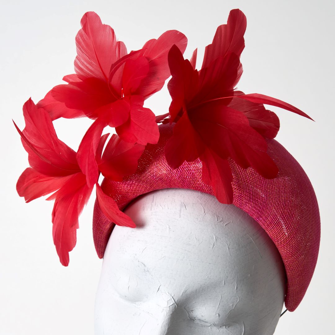 This Sinemay band features exotic feather flowers that are hand sculpted for a unique and eye-catching look. The hibiscus design is asymmetrical and is placed on a two-toned base for dimension and style. The elastic band allows for a comfortable and secure fit. Perfect for any special occasion.